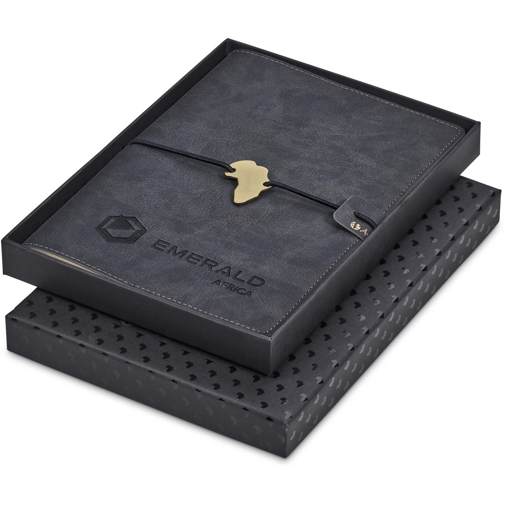 The soft feel and texture of this vegan leather notebook gives it a rich and authentic feel. It features stitched finishing and an elastic closure with an Africa shaped metal pendant. The A5 notebook can be removed from the cover and replaced, so this durable item could be a companion for many years to come.