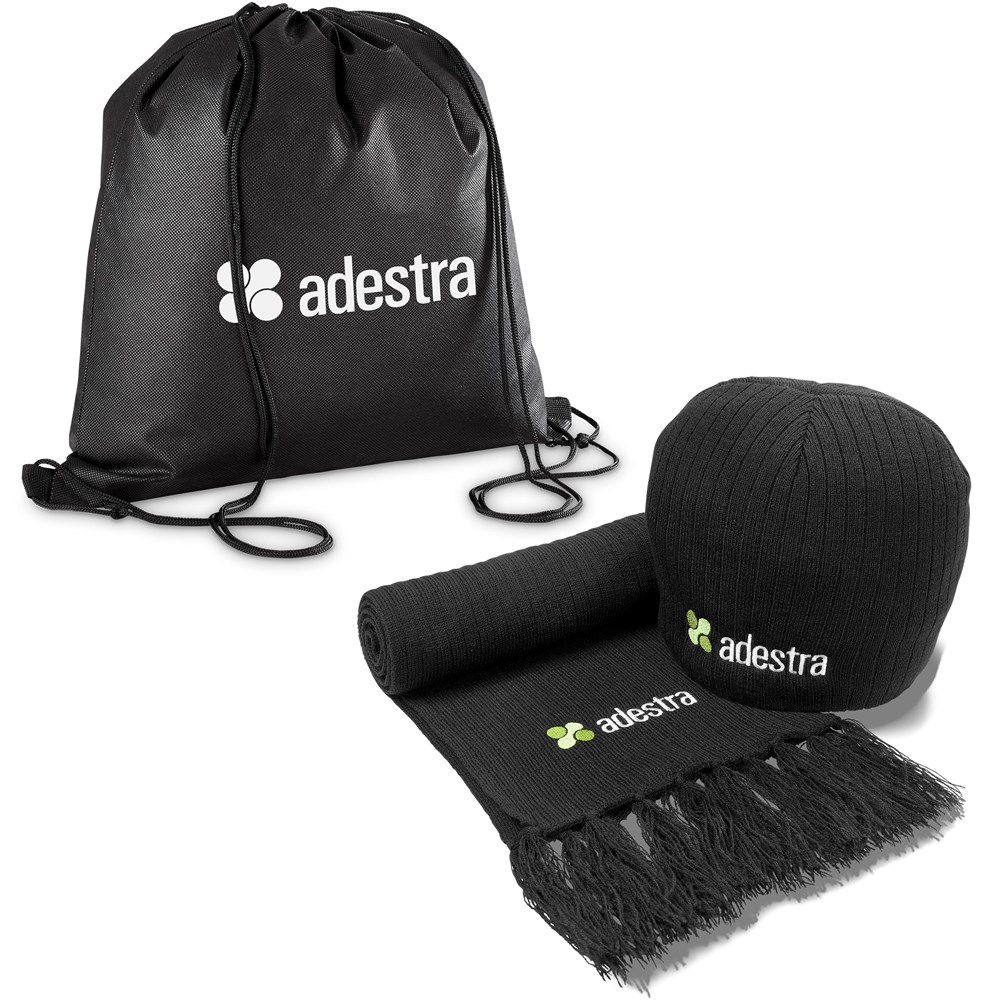 Stay warm this Winter, or in the outdoors, with this cosy scarf and beanie, packaged together in a drawstring bag.